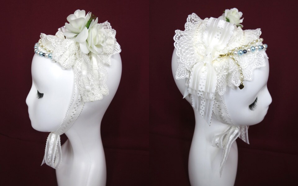 ■商品説明■ 繊細なチュールレースに、薔薇コサージュ・パールをあしらった上品なヘッドドレスです。