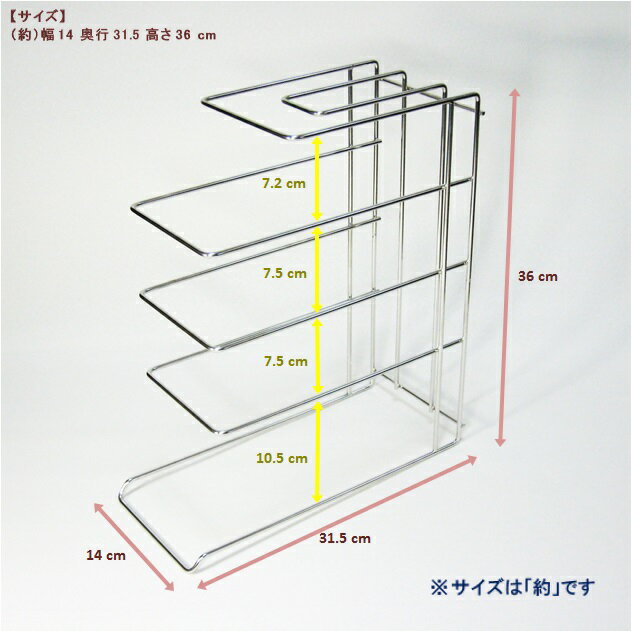もちろん、安心の日本製です 【 サ イ ズ 】 (約)幅 14 奥行 31.5 高さ 36 cm ●フライパンの入るスペースは 下から10.5cm、7.5cm、7.5cm、7.2cm です。