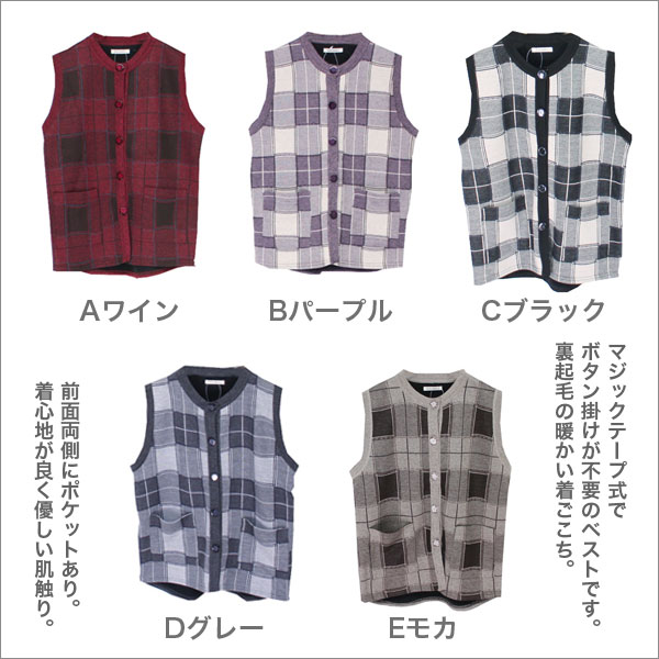 マジックテープベスト レディース 秋冬用 裏起毛 紫/茶/黒/グレー/赤 M/L